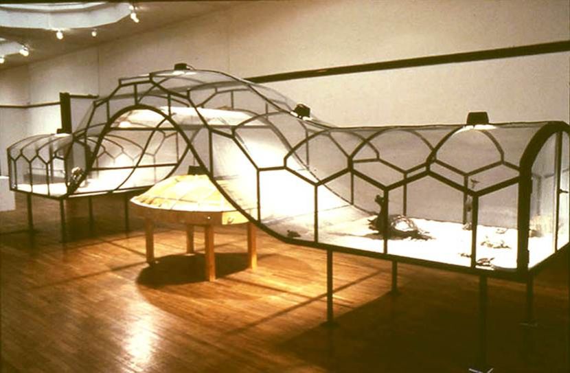 容易被我们忽视的是:之后媒体和展览中常看到的作品《世界剧场》,实际上是由1993年的《世界剧场》与1995年的《桥》两部分装置构成的一件大型的雕塑装置。由蛇形空间组成“桥”,相对宽敞明亮,位于“世界剧场”装置的上方,乌龟和蛇居于其间,还放置有祥瑞的动物形青铜雕塑,以一种理想主义的方式,让人联想到中国古老而传统的四方神的信仰崇拜。可以说,《世界剧场》与《桥》构成了关于生与死、混乱与秩序的动物寓言,仿佛“炼狱”与“天堂”,又似乎是全球局势下的现实政治生活的隐喻。《世界剧场》与《桥》这两部分组成了“世界剧场”,既符合道家思想的生死观与中国传统文化对“蠱”的认知,同时又能让西方公众产生联想到“权力”“凝视”“萨满教”的西方理论解读,共同构成了这件作品的视觉图式的整体,也丰富了作品的内在含义。也正是因为这样的视觉整体性,在多次展览遭遇争议时,两部分装置一并被撤空里面的动物,只留下了两件空荡荡的蛇形展柜和龟桌。