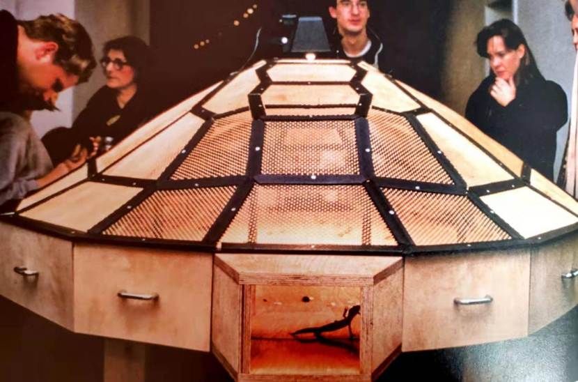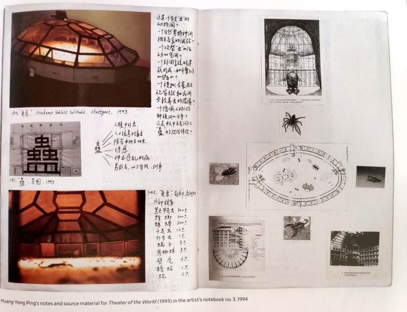 黄永砯在1989年参加“大地魔术师”并迁居法国巴黎,至此他对动物形象作为创作素材产生了兴趣。在“大地魔术师”上展出的《爬行动物》,将洗衣机里搅过的报纸堆集成龟形坟冢。他之后的《世界剧场》等系列作品,延续了对龟、玄武、蛇的形象的兴趣。1993年的《世界剧场》,是一个封闭系统的龟桌,围绕着中心建构了许多小抽屉,封闭的内部放有黑色甲壳虫、蟑螂、蟋蟀、千足虫、竹节虫、蝎子、鸟蜘蛛、壁虎、蟾蜍和蛇,展览时打开抽屉门,这些生物进入了一个物竞天择的人造公共空间,生活在一个自由又弱肉强食的空间里。在黄永砯的作品创作笔记中,我们可以看到他对这个模拟、复制、微缩的生态空间之反思。他对自己的作品连续进行了七个追问,追问其模拟生态的实验、巫术宗教祭祀、微缩斗兽场和复制边沁的全景敞视环形监狱、对不同种族间的斗争隐喻的意义,最终落脚于对中文“蠱”字的追根溯源与多重解读,这也继承了艺术家强调的作品的开放性的创作策略。