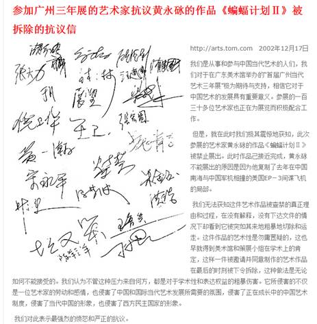 图13: 2002年参加广州三年展的艺术家抗议黄永砯的作品《蝙蝠计划II》被拆除的抗议信