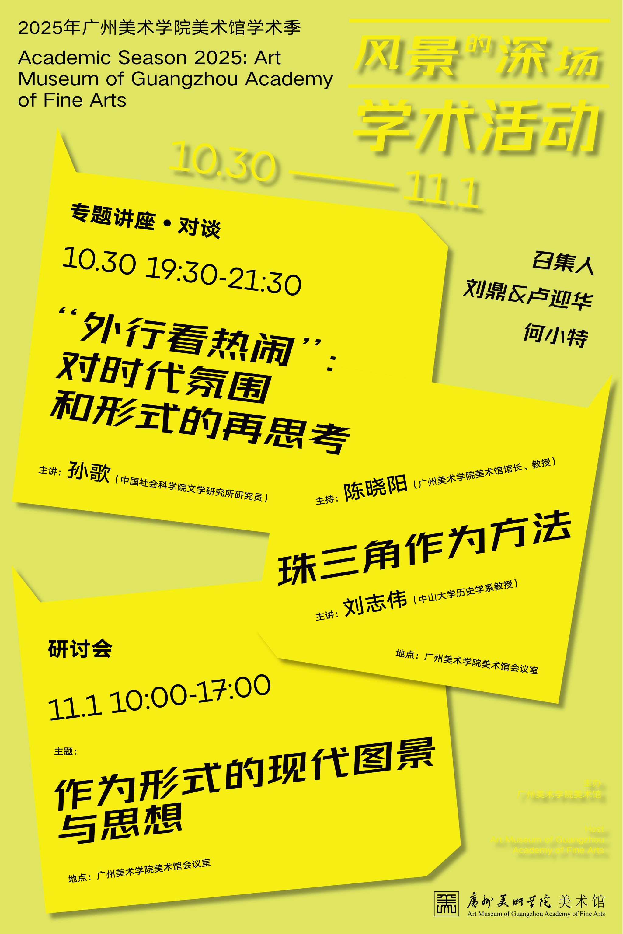研讨会嘉宾合影基于“民间”议题在现代进程下仍有被重新理解和激活的可能性,学术季特别组织了一场为期两天的学术研讨会,期待与各学科、各领域的研究者展开交流和讨论,以期在学术研讨环节能够捕捉展览现场的流动感受,延伸拓展对于“民间”和“美术”的崭新理解。学术季研讨会于9月13-14日在广州美术学院美术馆报告厅举行。研讨会第一板块: 现代中国政治文化实践中关于民间资源的思考、转化和利用中国社会科学研究院近代史研究所副研究员李志毓主持发言第一场研讨会由中国社会科学研究院近代史研究所副研究员李志毓女士主持,...