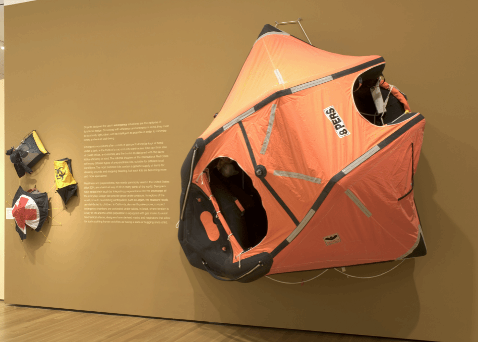 设计展“安全:设计承担风险”(Safe: Design Takes on Risk)[12]讨论的就是设计如何把危机和灾难转化为安全状态。这是MoMA自2004年11月重新开馆以来首次举行的大型设计展览,策展人保拉·安东内利和策展助理帕特里夏·章克沙·韦基里尼(Patricia Juncosa Vecchierini)搜集了300多件当代设计产品,涵盖了几乎所有形式的设计,从工业产品、建筑设计、服装设计、交通工具设计到信息设计,包括日常安全设备、生命支持设备、紧急避难所、难民庇护所、防护运动装备、排雷设备、紧急车辆、禁毒广告、生物工程领域等设计对象。策展团队专门开发了一个旨在“对紧急情况作出反应,并提供一种舒适感和安全感,致力于保护身心免受危险或压力环境伤害的网站”[13],并启用谷口良雄(Yoshio Taniguchi)为MoMA新设计的六楼空间进行设计。